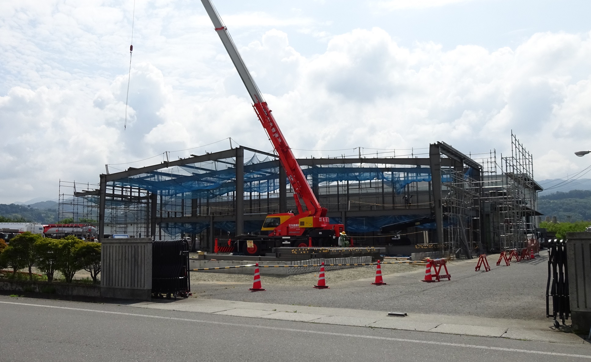 10日 高森町下市田工業団地の中のT社工場の鉄骨の建て方が始まりました。現場管理の所澤さんはこういう大きな工事が得意です。仮設工事も書類にも慣れていますが、何より性格が堅いので順序立てて仕事を進めるため間違いが起こりにくいです。この建物も道路際まで伸びてくるのですが、2工区に分けて進めていて全ての骨組みが組みあがるのは10日くらいかかる予定だそうです。安全第一でお願いします。