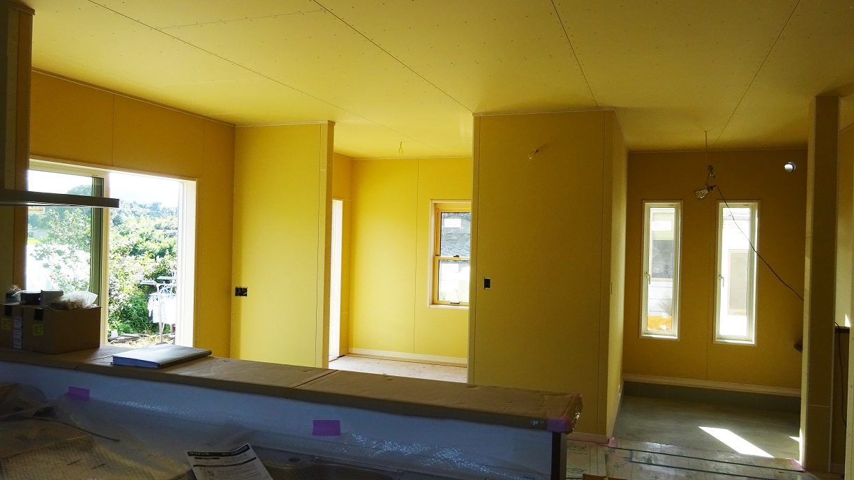 カットルーム 鼎名子熊のO邸の木工事検査を行いました。外観は白いタイル貼りのきれいという感じのお家です。それが玄関から中に入るとちょっと装い新たな雰囲気で、さらに居間のドアを開けると開放的な広々とした空間が現れます。その中に一段下がった小部屋のようなところがあるのですが、奥様の腕を活かしたカットスペースなんだそうです。今から家庭の賑わいが想われるような間取りですね。2階の寝室の広さも不思議ですし、メーターモジュールのトイレや階段も使いやすそうです。今までにない感じのお家になりそうで出来上がりが楽しみです。