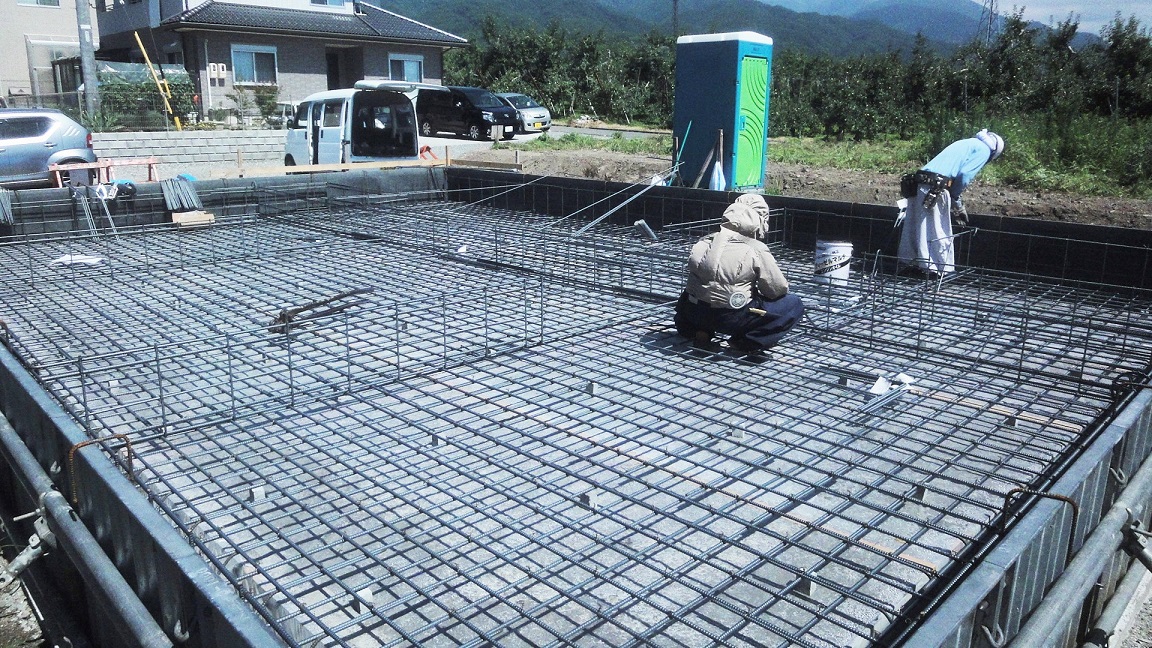 涼しい? 上郷黒田S邸の配筋を見ました。S様は建築の職人さんで、クレバリーホームの基礎工事を気に入ってくれたことも当社にお任せいただけた大きな要因だそうです。掘削や型枠工事の小室さんも硬い仕事してくれますし、鉄筋屋さんも職人さんが大勢いますがきちんとした間隔(縦横バッチリ)で組んでくれる良い仕事してくれます。その職人さんは忙しいので祝日も出勤でしたが、この炎天下で真冬のフル装備に見える格好です。近くによるとかすかな音がします。暑くないとは言ってましたが・・・。
