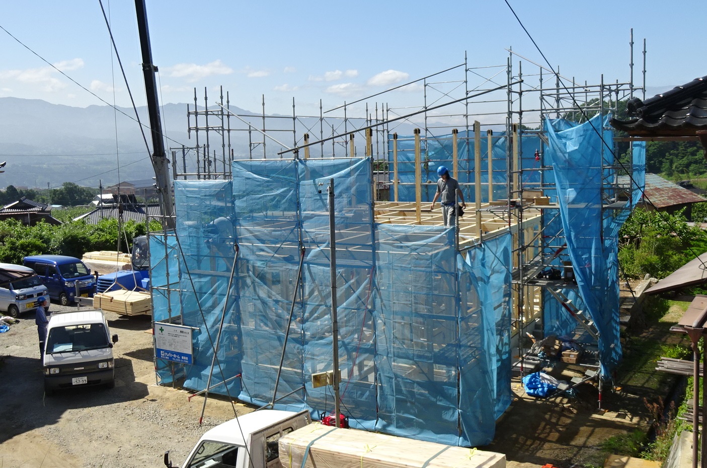 鼎切石のT邸の鉄筋工事が完了してコンクリート打設の準備ができました。前にあったような間隔が遠い所もなく本当にきれいに配筋されています。これを見ればこんなもんなんですが、ここまで現場では2つの懸念事項がありました。一つは基礎の掘削中に埋め土の中から砂の塊と言うか、ダンプで砂をすてたようなところが出てきて、ほんの一部だけですがサクサクのところがありました。地盤調査では全面診るわけにはいかないんで盛り土の敷地では何が出てくるかは分かりません。それで基礎屋さんに50cmくらい余計に掘ってもらいました。それから天気です。かなりの雨が降る予想だったため、掘った壁が崩れないように、また底が緩まないように塩沢さんたちが全面にシートをかけて水中ポンプを回して養生くれました。見えない基礎に陰の功労者ありですね。