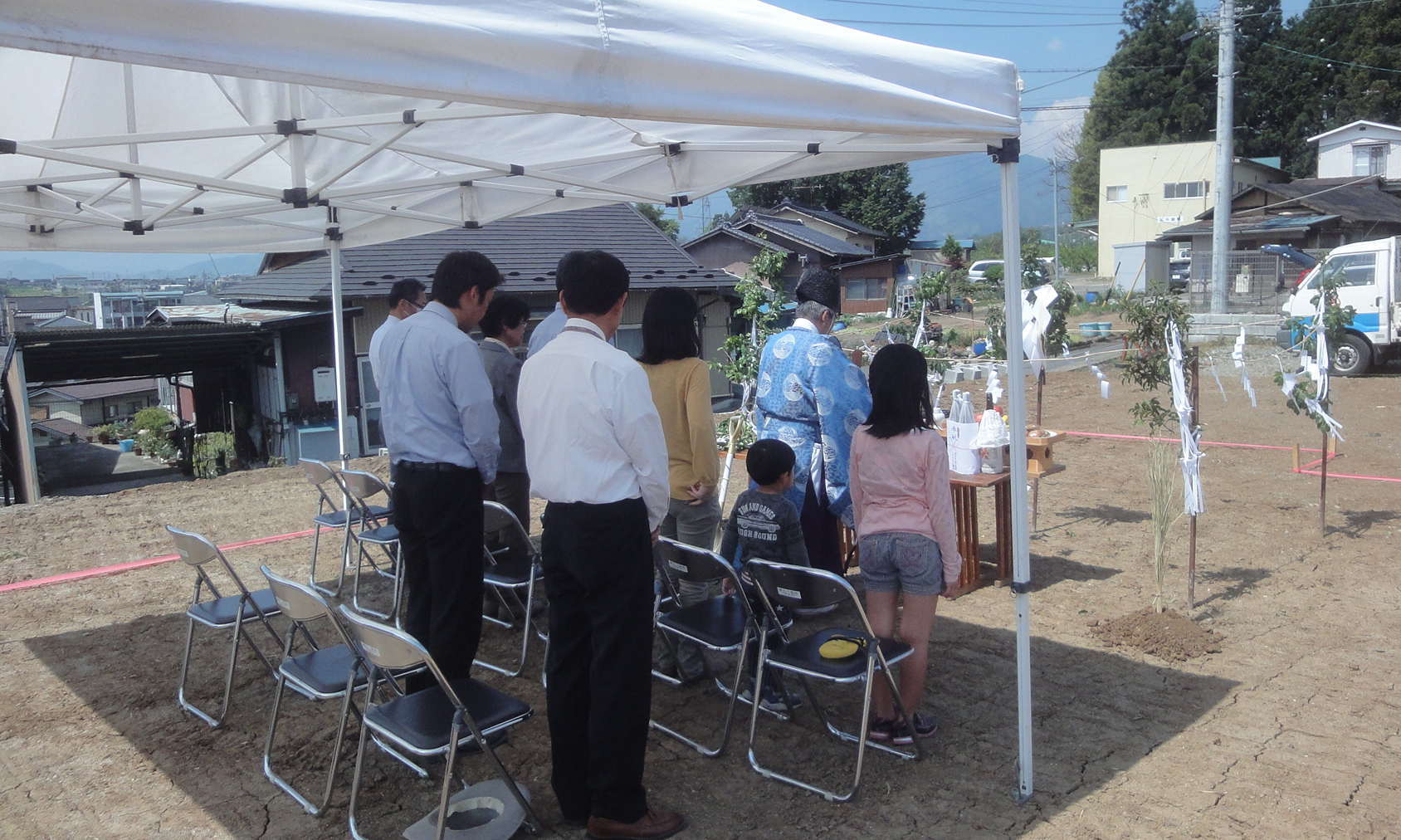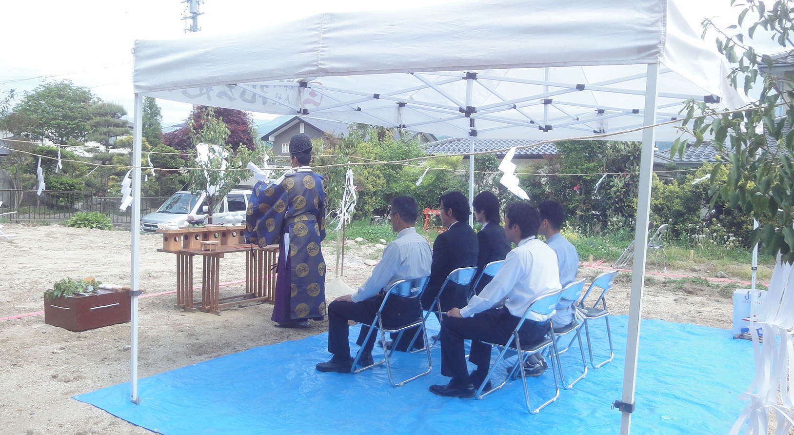 今朝の車の流れからは昭和の日でも勤務の人もけっこう多いと見受けられましたしたが、この時間になると県外ナンバーがかなり目立ちますので、さすがにゴールデンウィークって感じですね。そんな行楽日和の中で上郷黒田M邸の地鎮祭が行われました。今日の神主さんは先日の矢高神社の宮澤さんのお父さんが来てくれました。先日の様子から私は10分前に着けるように行ったのですが、もう準備完了でスタンバイされていてお待たせしてしまいまして恐縮しました。親子でもお祭りの仕方はかなり違いますので、やはりそれぞれの主張があるのですね。お施主様のM様は転勤のあるお仕事だそうですが、この立地の良い上郷に居を設けられることになりました。今日は松川でりんごを作っていらっしゃる実家のご両親も来ていただけまして賑やかにできました。みんな良い人達です。ありがとうございます。