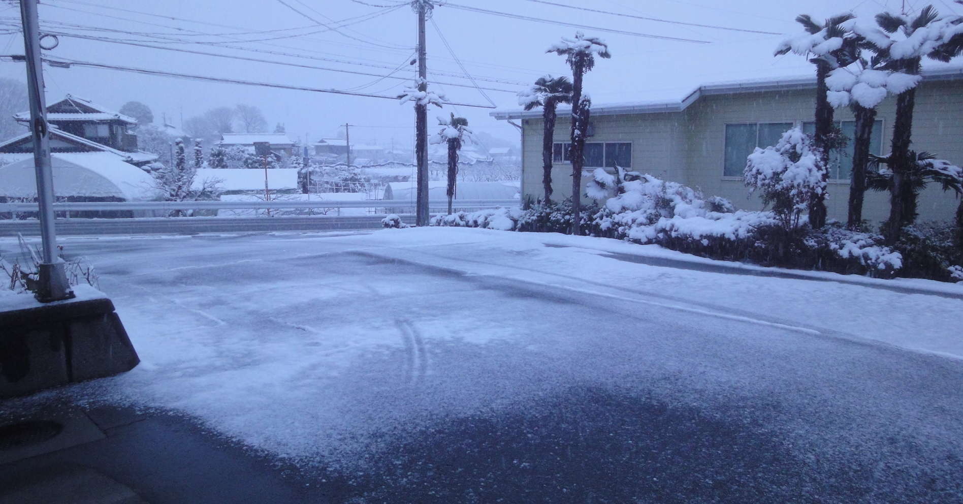 いやー、だいぶ融けましたがmax10cm近く積りましたか。今朝起きたら道こそ薄っすら白く、NHKの全国版ニュースで飯田4cmと紹介されたのですが、もう雨混じりになっていたので安心していました。湿っぽい雪でしたのでタイヤも滑らず会社に来れましたが、座光寺の消防署を過ぎて坂を上ると、偶然かどうか降りが激しくなり積もっている雪も多そうでした。雨になるにしても雪をかいておいた方が早く溶けるので、また運動にもなるので今朝は早く出社しましたが、来て見ると駐車場の舗装にはその割積っていませんでした。ところが、かいているうちに見る見る積り出し、後から専務たちが2回目3回目とかいてくれました。雪かきだけでも労力使いますが、交通や工事にも影響が大きな出ました。もう止んだようですが、明日の朝は凍結に注意して事故の無いようにお願いします。
