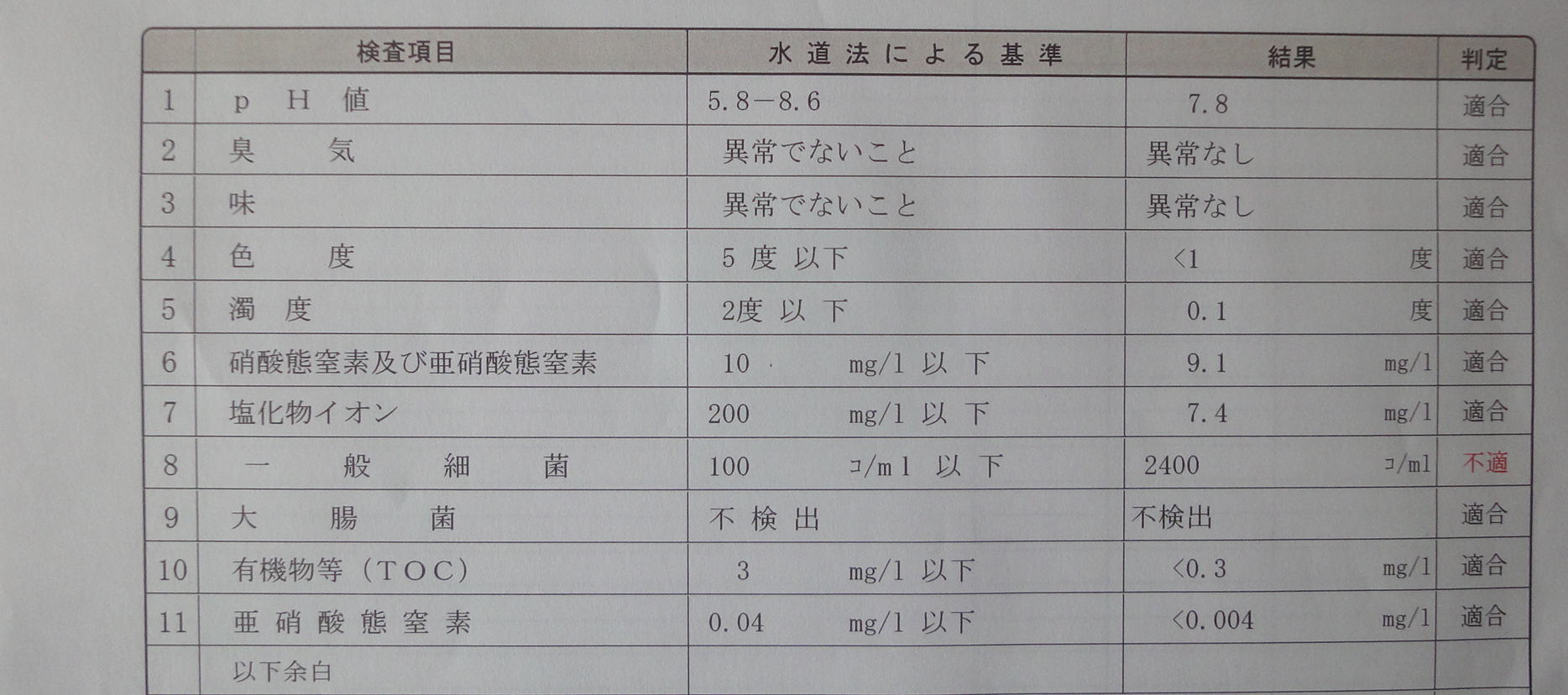 家の井戸水の水質検査の結果が送られてきました。予想外のところで不適の判定です。前は硝酸態窒素及び亜硝酸態窒素の数値が高く不適判定だったと記憶してますが、一般細菌がウジャウジャとは驚きました。ちょっと気持ちが悪いので井戸屋さんに聞いたところ、地下深くの水や、モーターなどの配管部分に細菌が棲みつくことはないのだそうで、雨水か何かが井戸に浸みているのではないかと言うのです。ウチの井戸の縦管の上にはコンクリートマスがありますが、そこから雨水が入っていると思われますので対策することにします。細菌なんで煮沸したり滅菌層を付ければ飲めるのですが、今は洗い水と池にしか使っていなくて、特に鮎の季節にはありがたい水なんです。