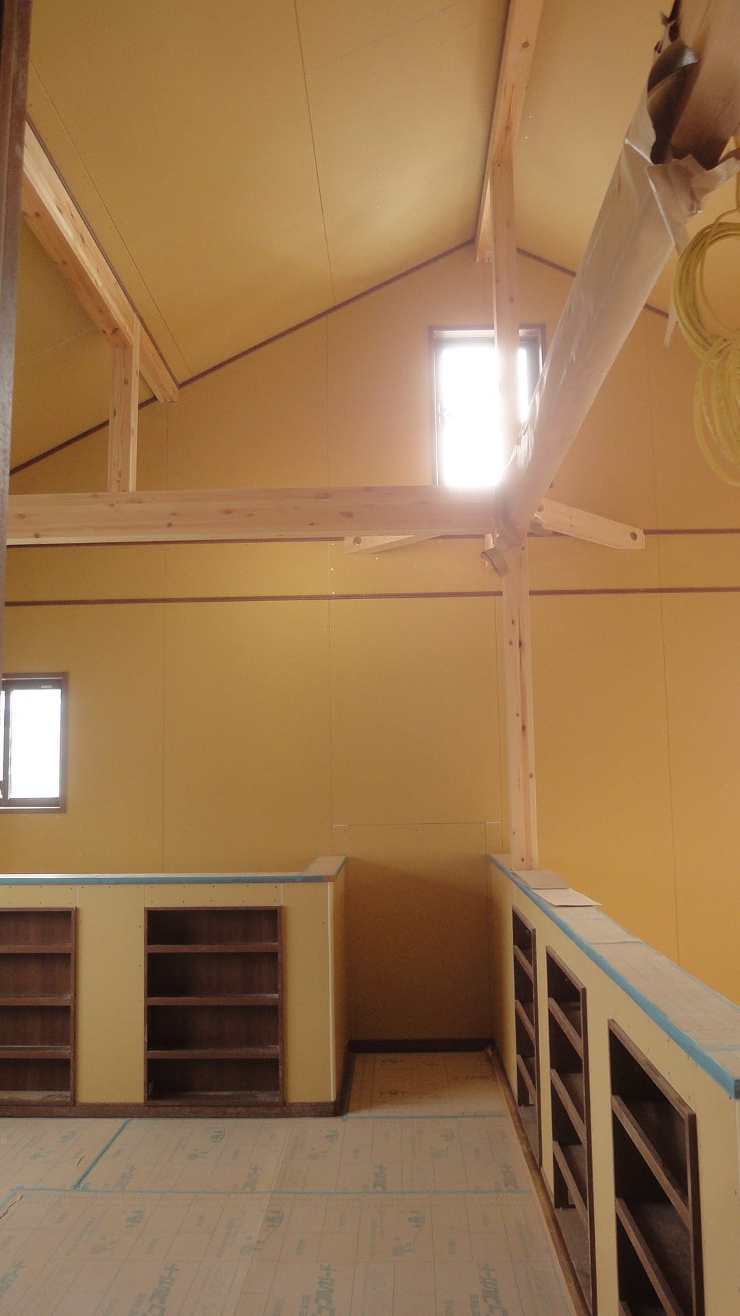 今年初めての建て方が高森町H邸で無事にできました。本来は昨年の内に上棟したかったのですが間に合いませんでした。大工さんたちも年末はただでさえ気忙しいので、あまり急いでもいい結果にならないというのが塩沢さんの判断だったと思いますし、安全が第一なので正解でした。私もまさかのことを考え棟札を保留しておき、これも的中でおかげで書初めができたのです。しかし、この頃の冷え込みはもう大寒なみで、あまり寒くても大工さんたちの動きが悪くなるので心配されましたが日中は少し暖かくて助かりました。見晴らしの良い落ち着いた外観のお家になりそうで楽しみです。今年からは、建て方の時に尚安全に作業できるように取り組んでくれることになりました。また一年無事故でできるようにお願いします。