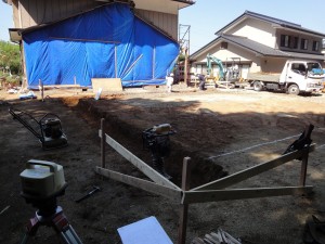 喬木村のK邸の基礎工事に着工しました。先週の土曜日の地鎮祭は専務に出てもらったので、現場に行くのは初めてで、聞いてはいましたが分りにくいところで、昨日熊谷君に地図を描いてもらったのにうろついてしまいました。道も狭く2t車がいっぱいなので、現場には少し苦労かけます。地盤は赤土でしっかりしていまして、谷側がすこし表土が被っていますが硬いので地盤調査通りで良いでしょう。ここは、既存の住宅を一部解体しての新築で、残った部分は以前の増築された住宅になっていますが、その構造補強についてお父さんと検討しました。聞けば、基礎屋さんをしていたというお父さんですが、やりがいがあります。