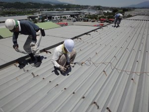 とある工場の屋根の塗装工事をさせていただいています。この工場は建ててから20年になるそうで、屋根の光沢はありませんし金物も錆びてしまっていました。この手の切版屋根は、鉄骨の梁と屋根をとめるのにボルトを使っていますが、このボルトが錆びてオイルをしみこませたパッキンが劣化してくると雨が漏るばあいがあります。それで一本一本ボルトの錆をとってから塗装をして更にプラ?のキャップを被せれば耐久性が上がります。しかしまぁ、やねの塗装工事は不思議と真夏が多いですね。塗装屋さんも熱中症にならないように気をつけてくださいね。よろしく願いします。