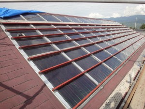 20年以上前になりますか?建てさせていただいたお家は、数年で雨漏れが起こってしまったのでしたが原因がなかなか解らず仕舞いになっていました。このお家は、今でも画期的なソーラーパネルによる全室温水床暖房のアクティブソーラーハウスなのでした。その屋根一面の集熱版の中には不凍液が通っていて、それが1、2階の床のコンクリートを通り暖める仕組みです。確かに現在の同じようなシステムと基本的には変わりはないのですが、今と違い、銅管などの配管でしたから凍結には弱かったので、いつしかシステムそのものが使われなくなりました。そのことと、雨漏れは別問題で、原因は今度のパネルに屋根をかける工事で分かったことなのですが、結局はパネルのコーキングの亀裂が原因でした。見た目は良好だし、触っても軟らかいのでだまされていました。けれども屋根面をコーキングで防水をしようとは間違いでした。やはり壁でも西側などは5年くらいが寿命ですから、屋根ではせいぜい3年くらいですか?いづれにしても屋根にソーラー、エアコンなどボルトを貫通するものは危険です。今回はパネルを屋根で覆ってしまうので完璧と言えますが、太陽光発電も注意が必要です。