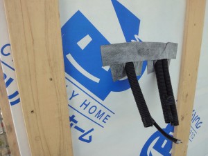 松川町のK邸の外壁防水検査をしました。この防水も大工さんによってきれいさが違います。透湿防水シートのピーンとした貼り方、サイディング下地の胴縁があるときはその整然とした打ち方など、性能に差があるわけではなく、ほんの少しの違いなのでしょうが見た目がきれいなのです。また、この電気の配管の貫通部分は電気屋さんの仕事ですが、いつもきちんとしてくれます。ここで大事なのは配管が必ず下を向いていることです。バッチリです。