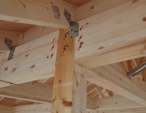 下条のS邸の建て方が無事終了できました。今日あたりから天気が悪い予報で、しかも下條は飯田より雨の降りだしが早いので、何時降ってくるかと気がかりでしたが、ここのところ大当たりの塩沢君の判断で3時には養生まで完了することができてホッとしました。現場で足場に上って見ると、外周りの柱と梁の接合部のボルトとドリフトピン接合の確認のマジックの印がありました。内部は大工さんがしてくれますが、塩沢君の念を入れてのチェックが仕事を確実にしてくれています。頼もしい限りです。