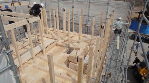三穂の地域振興住宅の上棟ができました。本当は明日が予定日だったのですが、雨の予報なので準備が整っていたので建ててくれました。クレバリーホームは、家を雨に濡らしたくないので建て方は極力一日で終わらせます。その代わり、建てるまでの準備は、柱梁に金物をつけたり、土台を敷いたり、材料を使う順番に現場に搬入したりなどで数日かかります。そして、大工さんの当日の建て方作業は6、7人で行い、屋根に防水フェルトを貼り、外壁に雨が入らないようにブルーシートで覆って完了です。今日は、棟梁は山田さん、応援に桜井さんほか5名の計7人で、相変わらずの息の合った、しかも素早い仕事で無事完了しました。ありがとうございました。ちなみに、柳桜はまだつぼみでした。