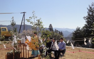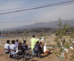 ようやく春らしい陽射しの中、縁起の良い日に下条のS邸の地鎮祭がおこなわれました。ここは、当社の熊谷君のお家の少し上(西)の方で、国道からも近いところです。天竜川に向かった傾斜地の田んぼを造成して、南向きの日当たりの良い宅地ができました。お父様いわく、工事では大きな石がゴロゴロ出てきたとのことで、切り土の部分に建てるので地盤は良いらしく、踏んでみても本当に硬いので地盤補強は要らないと思われます。天竜川の向こう側は泰阜で、その遠くには南アルプスの南端らしき雪のある山が見えます。楽しいお家になりそうです。