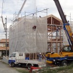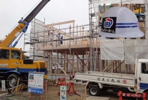 今日は、朝から一日中ハッキリしない天気(朝ほんの少しパラついた)の中で、豊丘のI 邸の建て方が行われました。ここの棟梁は小瀬水さんで、今日は熊谷さん、桜井さんと山田さんが応援してくれて息の合った6人で行われました。切り妻屋根なので3時にはフェルトが大方貼れて、4時には塩沢君から完了のメールが入りました。現場に行くと、ジュンコさんがヘルメットを見せてくれました。すると、この頃テレビでなじみのメジャーなシールが貼ってありました。もちろん塩沢君のにもです。僕にもちょーうだい!