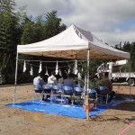 今日は、桐林でU邸の地鎮祭が行われました。昨夜まではすごい雨で、今朝もまだ降っていたので、これは地鎮祭はどうなるのか心配でしたが、起きるとだんだん小降りになってきて7時頃にはなんとか止みました。そして地鎮祭が始まる10時前には晴天どころか陽射しが強く暑くなり、テントがなければ熱中症になるくらいになりました。お施主様の日頃の行いが良かったのですね。雨降って地固まりました。今日は、お施主様ご夫妻と、まだ抱っこにおんぶのお子様、旦那さんのお若くて美しいお母様、奥様のご両親が出席され賑やかにできました。奥様のお父様は、クレバリーホームの電気工事をしていただいている社長さんで、会社の協力会の副会長を長くお世話になっています。本当にお世話になります。