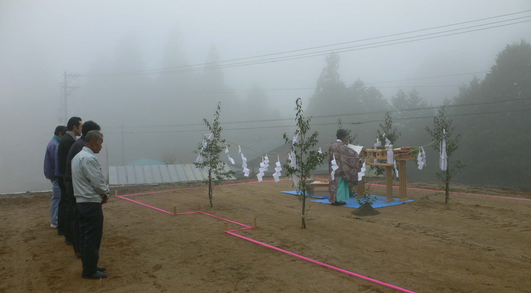 今日は、泰阜村稲伏戸地籍でH邸の地鎮祭がありました。ここは泰阜でも北の方で飯田市からわりあい近くて座光寺からでも35分くらいで着きますが、道が分かりにくいので慣れない人にはナビが必要です。この地籍は昔は一つの村だったとのことで、近くに熊野神社と室伏戸の仏像を奉った古いお堂があり、お父様の話しによれば歴史のある地区だそうで、なるほどお宝がありそうな家が点在しています。敷地は元田んぼだったのをお父様がみやましい石積みで造成してくれて、陽当たりがかなり良くなっています。地鎮祭にはH様とお父様が出席されましたが、お嫁さんは赤ちゃんが生まれたばかりで、またお母様は式の後のお茶の準備をしてくれていたのでした。式の間は霧が深く幻想的でかなり冷え込みましたが、温かいお茶をいただき生き返りました。