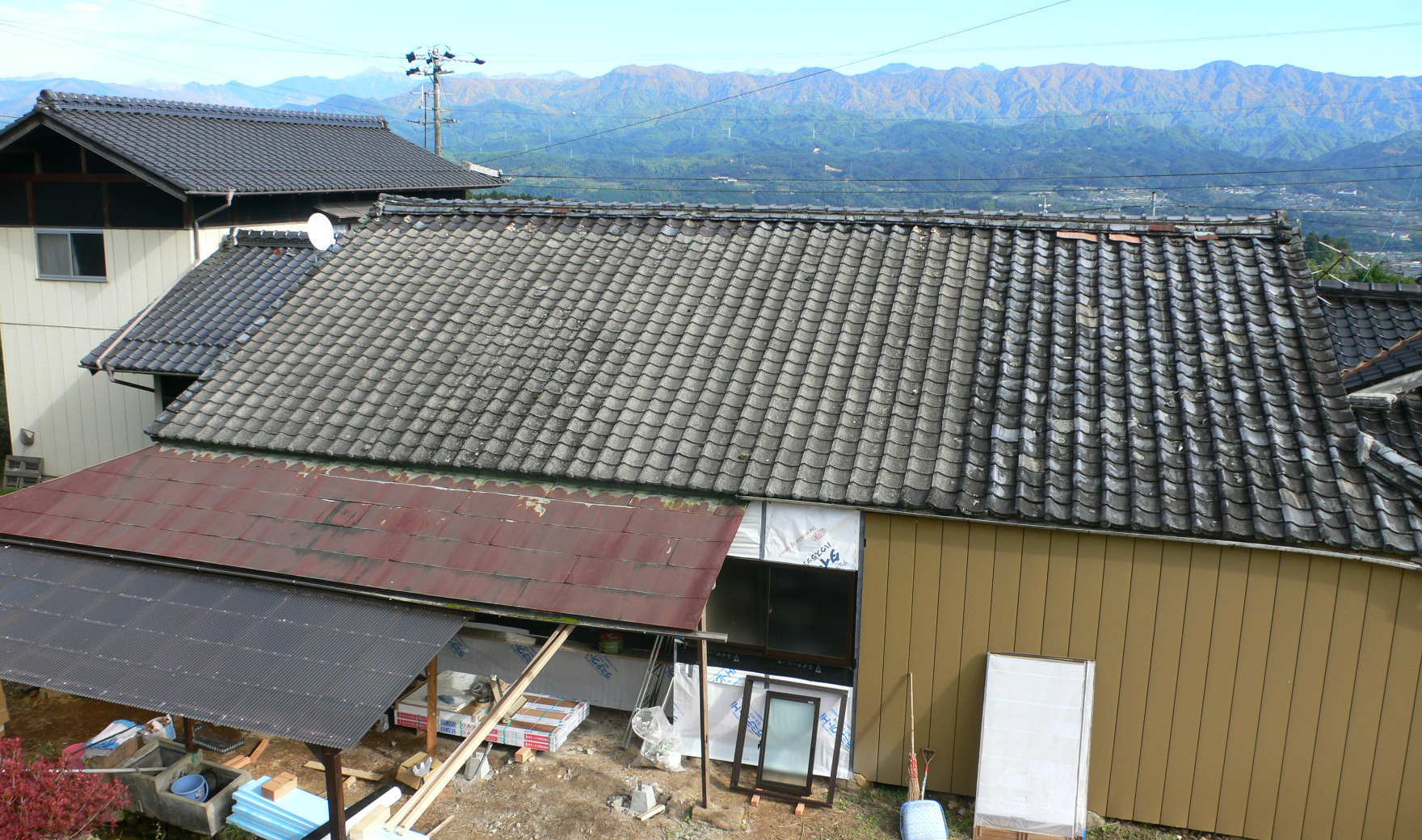 今日は高森町のN邸のリフォームの様子を見に行きました。ここは、ライファの上沼店長の同級生のお家で、山吹の中央道のすぐ上にあります。内部はおばあさんのお部屋中心の工事と、屋根の瓦の葺き換えが主な仕事です。今は大工さんの下地作りをやっていまして、既存の繊維壁などを上手にカバーしてくれています。また、瓦屋さんも換える予定でないところに割れた瓦があるのも換えてくれると言ってくれていました。それにしても、(南アルプスの)良い景色のあるお家です。