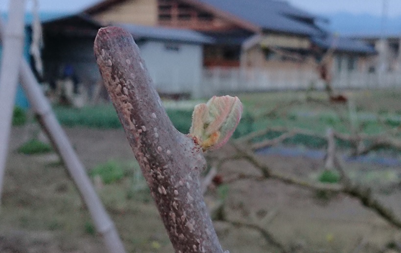 移植 またまた新芽なんですが、これを見つけた時はホントに嬉しかったです。これは家の畑のキウイで、実はブドウを伸ばすのに邪魔なので去年のうちに一か八かで移植をしたのです。植えてから7、8年は経ちますか?人の都合だけで枝や根をいいだけ切られキウイには大迷惑で、しかも雄の木は労力の手抜きから根の土をほとんど振るわれて瀕死の状態だったと思われます。こちらは雄の木だったと思うのですが、雌に遅れること1週間くらいで芽を一つ出してくれました。生命がつながってホッとしました。