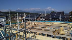 最近めずらしく霧の無い朝でした。日中は暑いくらいの良いお天気になり、豊丘村のA邸が無事に上棟できました。大工さん8人と見習の大工女子1名での作業はみるみるうちに進んでいきます。お施主様のご家族も午前中に見に来られて感動されたとの連絡いただきました。それでも4時過ぎに完了メールが入るまでは気が抜けません。ありがとうございました。