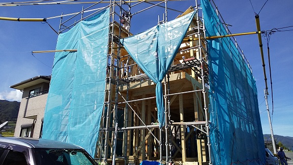 大瀬木のN邸が、ご実家の同じ敷地内に無事上棟できました。足場があるのでかなりくっついて見えますが、完成すれば採光も通風も採れると思います。近くで別居、土地代は要らないし、なにかと面倒は