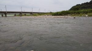 、そう聞いて行っても良い思いどころかボウズのような経験だけなので、(変人的な)人とは違ったところ。場所は糸魚川の近く、道路が良くなり3時間弱でとうちゃこ。釣具屋さんでは、この濁りではやめろとは言わないまでも望みは薄いよとのこと。こういう海の近く(鉄橋の向こうは海)は鮎は小さくても元気が良いとか。開拓地、型もそこそこでそれなりに楽しめました。
