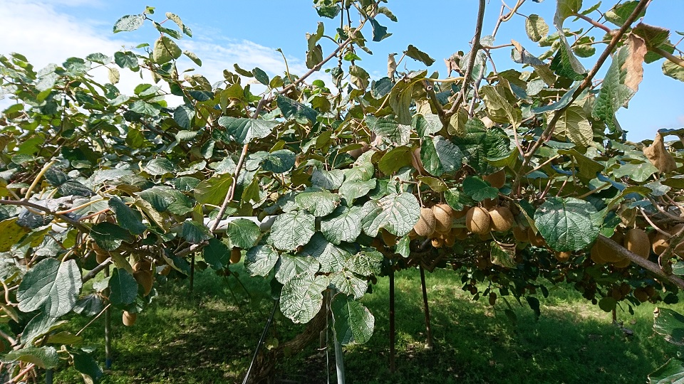まだまだ 久しぶりにキュウイ畑を見てきました。今までは霜が降りる頃取っていましたが、今年は果実は何でも早いので、どんなもんかと思ったのです。しかし、やっぱりまだちょっと収穫には早そうです。NETでは果実を持ち上げるとポロっと取れるとありましたがしっかりしていて何個か引きちぎってきました。リンゴと一緒にスチロールの箱に入れて熟すのを待ちます。